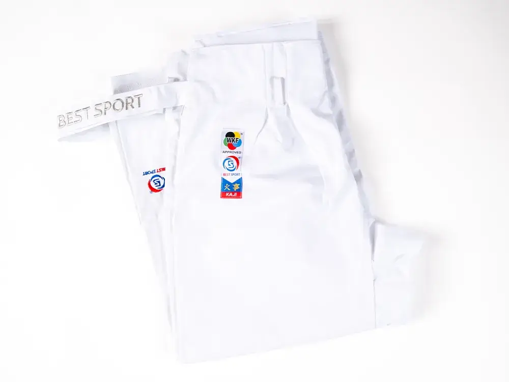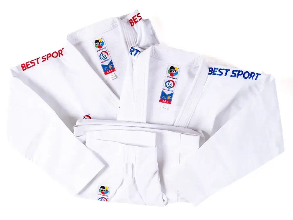 KAJI, 13oz, KATA, sharp sound canvas 1 Red Jacket + 1 Blue Jacket + 1 Bottoms. BestSport brand embroideries on chest and back. Produced with embroidery on the shoulders, red or blue. High drawstring waistband. Sharp sound canvas – during fast move it emits a popping noise.